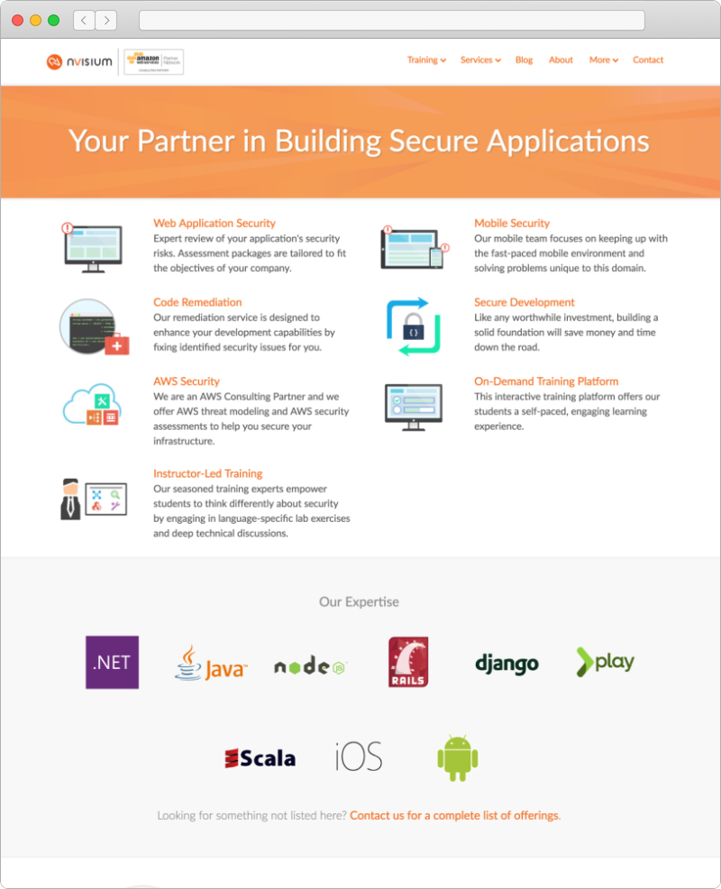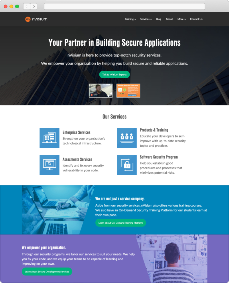 For a while, I served as the sole designer for the application security startup. nVisium. I led all the design efforts for the company — ranging from web front-end development, branding, to media editing and production.